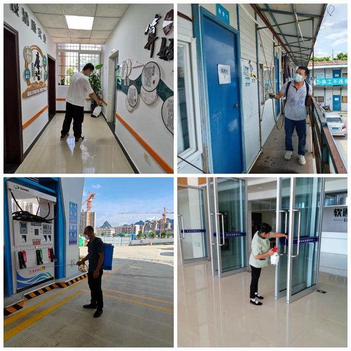 消殺人員全面對集團辦公區域樓道、會議室、衛生間等部位進行環境消殺,對辦公室門把窗鎖、電腦鍵盤鼠標、座椅扶手等頻繁接觸部位進行清潔消毒;對物管小區大門、單元入戶門、小區綠化帶、樓梯通道、電梯轎廂、樓梯扶手、垃圾桶、信報箱等各公共區域進行全面擦洗消毒,及時清運小區垃圾,清理衛生死角;對平安立體停車庫、平安加油站、姑婆山小鎮路花新村項目、城東污水處理廠項目等開展防控消殺。僅一天時間,城投集團共消殺辦公場所49處,項目工地44個,物管小區3個,進行了“無死角、無盲區、全覆蓋”的地毯式消毒作業。
