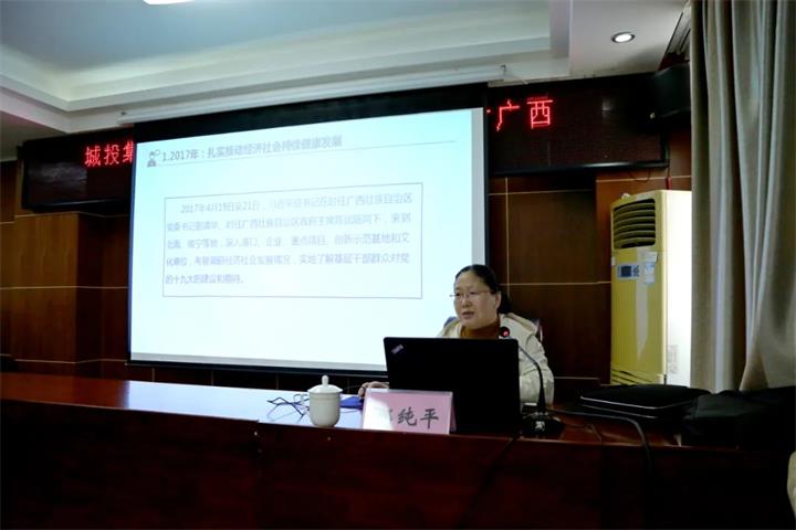 會上,郭純平教授從黨的十八大以來習近平總書記三次赴廣西考察調研切入,全面解讀習近平總書記對廣西提出的“四個新”總要求以及“五個更大”重要要求,深刻闡述了習近平總書記對廣西重大方略要求的重大意義、豐富內涵和實踐要求?,F(xiàn)場講解內涵深刻,既有深入的理論思考,又有豐富的實踐總結,為廣大黨員全面深入貫徹落實習近平總書記對廣西重大方略要求、推動各項重點工作指明了方向和路徑。