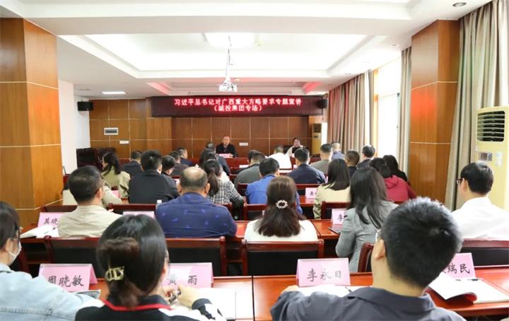 為深入學習宣傳貫徹習近平總書記對廣西重大方略要求,3月26日,城投集團黨委舉辦學習貫徹習近平總書記對廣西重大方略要求專題宣講報告會,邀請賀州市委宣講團成員、賀州學院馬克思主義學院副院長、教授郭純平為集團黨員領導干部作專題宣講報告。集團黨委副書記、工會主席梁輝露主持會議。